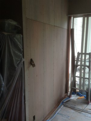 構造用合板を専用の釘で打ち付け、クロスで仕上げます。